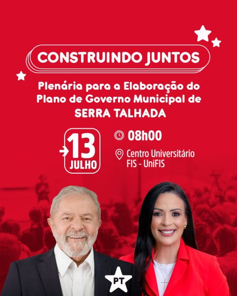 Plenária – O Partido dos Trabalhadores (PT) de Serra Talhada realiza no próximo sábado (13), a partir das 8 horas, na Faculdade de Integração do Sertão (FIS), a plenária, intitulada “Construindo Juntos”, para elaboração do Plano de Governo Municipal. A plenária tem como objetivo principal envolver a comunidade na construção colaborativa do nosso Plano de Governo Municipal. “Queremos ouvir as vozes dos cidadãos, entender suas necessidades e trabalhar juntos para criar um futuro próspero e inclusivo para Serra Talhada”, disse a prefeita Márcia Conrado.