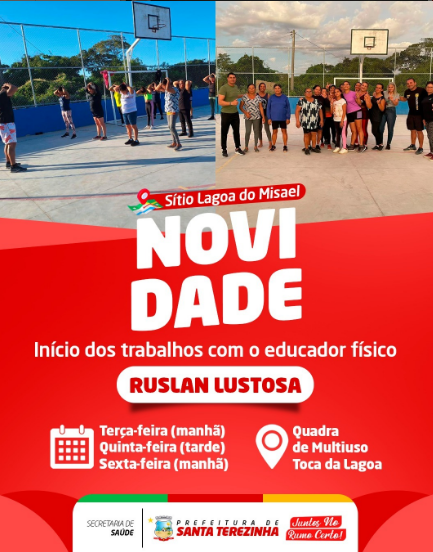 Você sabia – Que a Prefeitura Municipal de Santa Terezinha, inicio na Comunidade LAgoa do Misael, aulas de Educação Física com o educador professor Ruslan Lustos. As aulas acontecem nas terças-feiras de manhã, quintas-feiras à tarde e sextas-feiras de manhã no sítio Lagoa do Misael, na Toca da Lagoa.