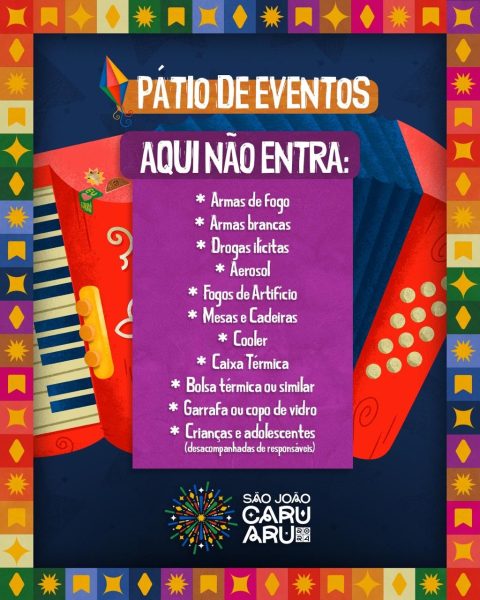 Sirva de exemplo – A Prefeitura de Caruaru, por meio da Fundação de Cultura, divulgou a lista dos que não poderão circular nos Pátio de Eventos Luiz Lua Gonzaga durante o São João 2024. O objetivo desta medida é garantir a segurança de todas as pessoas que estarão curtindo os dias de festa. O Maior e Melhor São João do Mundo, na zona urbana, começará neste sábado 1º de junho e seguirá até o dia 29 do mesmo mês. Confira a lista abaixo: Armas de fogo, Armas Brancas, Drogas Ilícitas, Aerosol, Capacetes, Fogos de artifício, Mesas e cadeiras, Cooler, Caixa térmica, Bolsa térmica ou similar, Garrafas ou copo de vidro. Ainda é importante destacar que crianças e adolescentes que estejam desacompanhados dos seus pais ou responsáveis não poderão entrar no Pátio