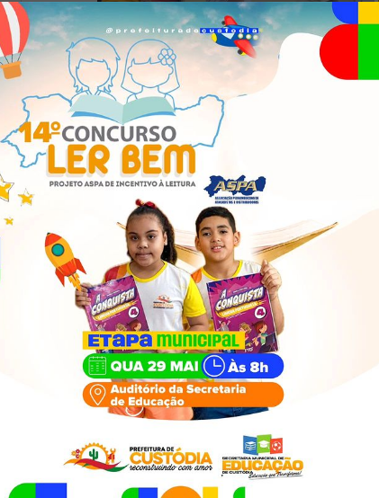 Amanhã – A Prefeitura Municipal de Custódia, com a coordenação da Secretaria Municipal de Educação, realiza nesta quarta-feira (29), o 14º Cncurso Ler Bem, etapa municipal, Projeto ASPA de Incentivo à Leitura, será a partir das 8 horas no Auditório da Secretaria Municipal de Educação.