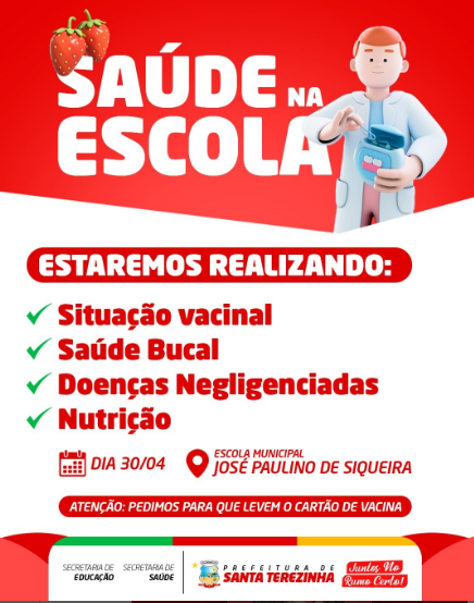 Hoje – A Prefeitura de Santa Terezinha, através das Secretarias Municipais de Educação e Saúde, realizam nesta terça-feira (30), na escola José Paulino de Siqueira, o Programa Saúde na Escola. “Vamos ofertar vários serviços nesta manhã, Verificação da situação vacinal, Saúde Bucal, Doenças Negligenciadas e ações na área de Nutrição, esperamos contar com a população, porque saúde é uma das prioridade do nosso governo”, disse o prefeito Delson Lustosa.