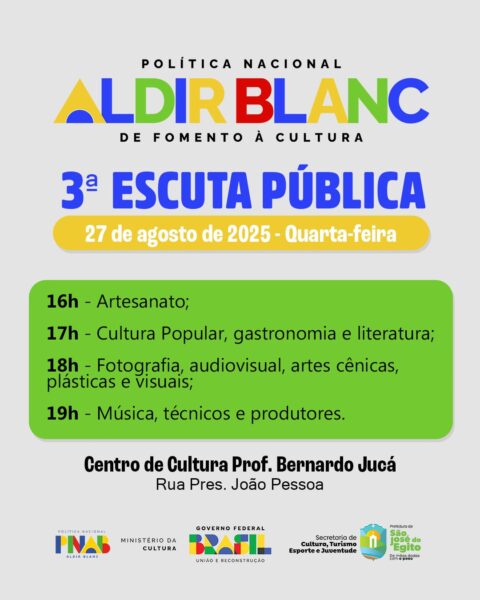 A Prefeitura de São José do Egito, por meio da Secretaria de Cultura, convida todos os agentes culturais do município a participarem da 3ª Escuta Pública da Política Nacional Aldir Blanc (PNAB).