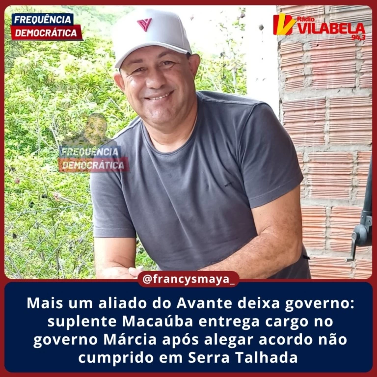 Macaúba , suplente de vereador do Avante, que obteve 495 votos nas eleições de 2024, entregou o cargo de Assessoria na Prefeitura de Serra Talhada. Segundo uma fonte, a entrega do cargo se dá em solidariedade ao amigo Sebastião Oliveira, que teve o acordo não cumprido pela prefeita Márcia Conrado