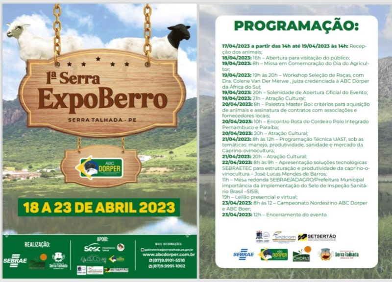 O município de Serra Talhada, no Sertão do Pajeú, vai sediar, entre os dias 18 e 23 de abril, a ExpoBerro, maior exposição de Caprinos e Ovinos do Nordeste. O encontro, promovido em parceria com Associação Brasileira de Dorper e Whiter Dorper (ABCDorper), com realização da Prefeitura Municipal, Conselho Municipal de Desenvolvimento Rural e Urbano Sustentável e Sebrae, tem uma expectativa de movimentar até R$ 5 milhões na cidade sertaneja, a primeira de Pernambuco a sediar o encontro.