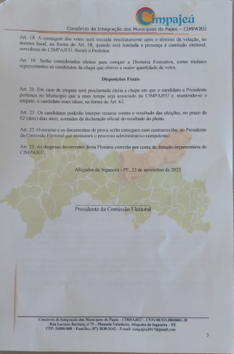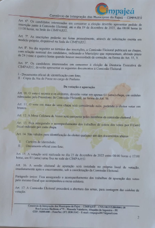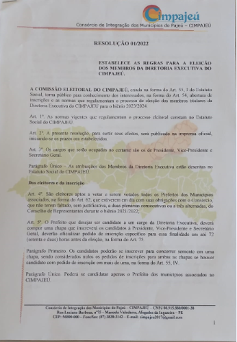 A Comissão Eleitoral do CIMPAJEÚ – Consórcio de Integração dos Municípios do Pajeú, de acordo com o art 55, I do Estatuto Social, torna público para conhecimento dos interessados na forma da Art 54, a abertura de inscrições e as normais que regulamenta o processo da eleição da Diretoria Executiva do CIMPAJEÚ, para o biênio 2023/2024.
