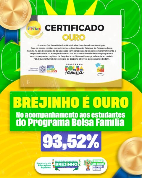 O município de Brejinho acaba de alcançar um marco importante para a educação: recebeu o Selo Ouro no acompanhamento da frequência escolar dos estudantes beneficiários do Programa Bolsa Família, obtendo 93,25% de pontuação.