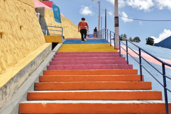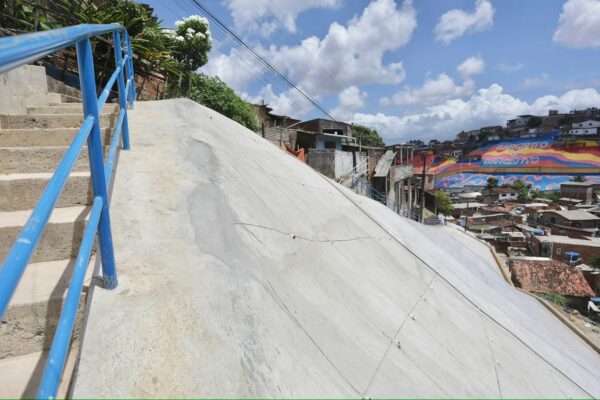 Iniciada em maio de 2023, a intervenção contemplou a construção de cinco muros de arrimo, totalizando 3.839 m³, além de 6 mil m² de proteção de talude com tela argamassada. O trabalho incluiu ainda 510 metros de drenagem, 170 metros de escadaria para melhorar a acessibilidade e a implantação de 300 m² de piso intertravado.