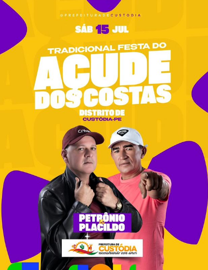 Realiza – A Prefeitura de Custódia, realiza neste próximo sábado (15), a tradicional festa do Distrito do Açude dos Costas, tendo comoatração adupla Petrônioe Placildo. O prefeito Emmanuel Fernandes(Manuca), estará presentes, prestigiando este grande evento.