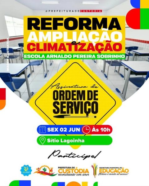 Assina – O prefeito de Custódia, Emmanuel Fernandes (Manuca), estará nesta sexta-feira (02), no Sítio Lagoinha, onde vai assinar a reforma, ampliação e climatização da Escola Arnaldo Pereira Sobrinho, será às 10 horas.