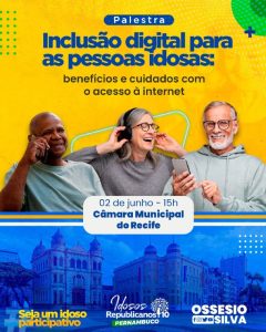Palestra – Nesta sexta-feira 02 de junho, às 15 horas, o Idosos Republicanos vai realizar, na Câmara Municipal do Recife, a palestra com o tema inclusão digital: benefícios e cuidados com o acesso à internet.O evento terá a participação do secretário nacional do Idosos Republicanos, Ossesio Silva e do presidente estadual do Republicanos em Pernambuco, deputado federal Sílvio Costa Filho. O publicitário e analista em Social Mídia, Ivson Souza será o renomado palestrante do evento. Também foram convidados especialistas conceituados para a palestra e o debate. Irão compor a mesa dos trabalhos do evento, os republicanos, o 2° vice-Presidente do partido em Pernambuco, deputado estadual William Brígido; a Secretária estadual do Mulheres Republicanas, vereadora do Recife Professora Ana Lúcia e o Secretário estadual do Idosos Republicanos da Paraíba, deputado estadual da Paraíba, Jutay Menezes. Também estará presente na palestra, a vereadora de Olinda, Denise Almeida (Republicanos).