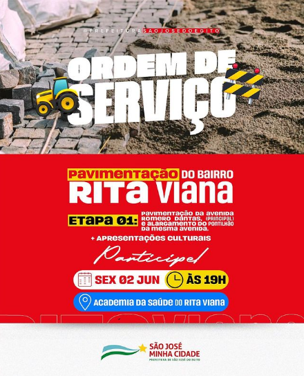 Assina – O prefeito de São José do Egito, Evandro Valadares, assina nesta sexta-feira (02), a Ordem de Serviço da Pavimentação da Avenida Romero Dantas, principal avenida que cruza o bairro Rita Viana e alargamento do pontilhão em sua primeira etapa. O evento será às 19 horas, na Academia da Saúde do Bairro Rita Vian, com apresentações culturais.