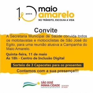 Reunião – A Prefeitura Municipal de São José do Egito, através da Secretaria Municipal de Saúde, convida os mototaxistas e motociclista para uma reunião alusiva a campanha “Maio Amarelo’, nesta quinta-feira(11), às 18 horas no Centro deInclusão Digital.