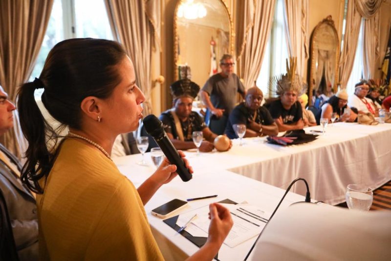 A governadora Raquel Lyra recebeu, nesta segunda-feira (8), no Palácio do Campo das Princesas, representantes de diversos povos indígenas para dialogar sobre as necessidades das comunidades nas quais esses grupos vivem. Na ocasião, a gestora ouviu os pedidos das lideranças, focados na pauta da educação, e conversou sobre possíveis caminhos para solucionar os problemas apresentados. O deputado federal Túlio Gadêlha também esteve presente na reunião.