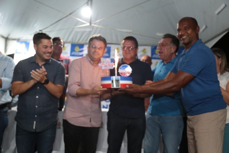 No meio da cerimônia, o Prefeito foi surpreendido pela população e moradores que subiram ao palco com um bolo em celebração aos seus 45 anos de idade.
