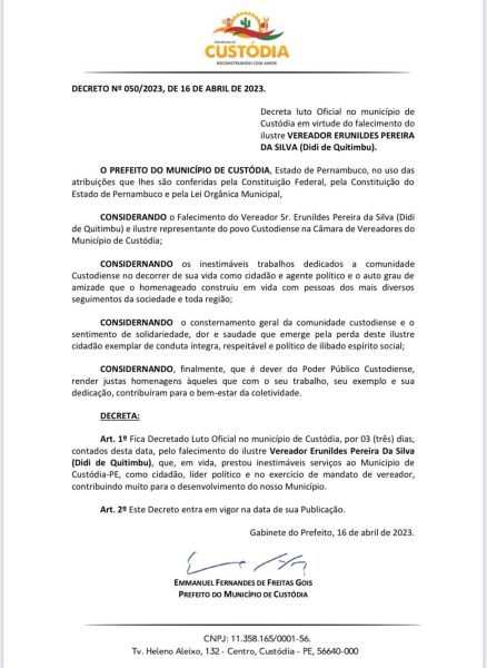 Decretou – O Prefeito de Custódia, Emmanuel Fernandes (Manuca), no uso das atribuições, decretou luto oficial por três dias, em virtude do falecimento do vereador Sr. Erunides Pereira da Silva – Didi de Quitimbu, no município de Custódia/PE.