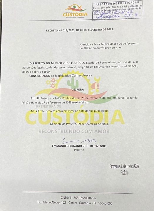 Mudou – O prefeito da cidade de Custódia, Emmanuel Fernandes (Manuca), em decreto antecipou a feira livre do município do dia 20 de fevereiro (Segunda-feira de carnaval), para a a próxima sexta-feira (17).