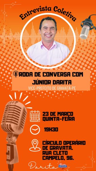 O atual Vice-Prefeito Júnior Darita realiza nesta quinta-feira às 19:30 hoas, uma Entrevista Coletiva- Roda de Conversa com Darita, que acontecerá no Círculo Operário, para falar de seu posicionamento político daqui pra frente e esclarecer a todos dos últimos acontecimentos.