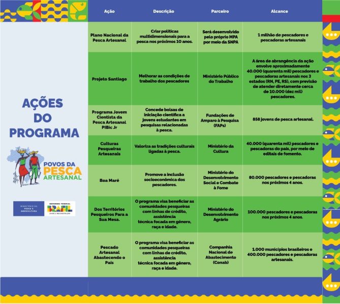 O Governo Federal lança hoje (2) o programa Povos da Pesca Artesanal. Ele vai beneficiar aproximadamente um milhão de pescadores e pescadoras em todas as regiões do país, com maior concentração nos estados do Norte e Nordeste. O programa é composto por sete diferentes ações, a serem executadas em conjunto por quatro pastas, com a coordenação do Ministério da Pesca e Aquicultura — recriado pelo presidente Luiz Inácio Lula da Silva em janeiro passado.
