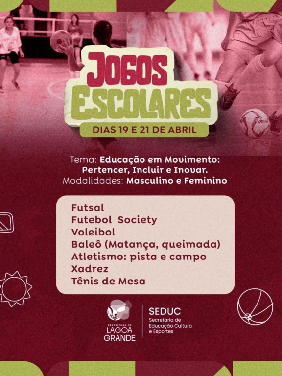 A Prefeitura de Lagoa Grande, através da Secretaria de Educação, Cultura e Esportes, realiza nos dias 19 e 21 de abril a edição 2026 dos Jogos Escolares, do município. A competição reunirá estudantes da rede municipal em uma grande celebração ao esporte e à educação.