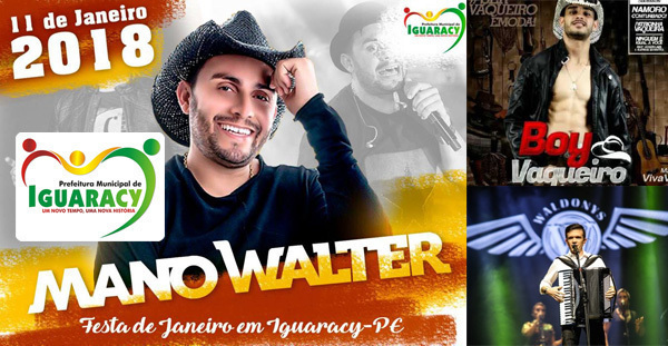 Anunciou – O prefeito de Iguaracy, Zeinha Torres, anunciou as atrações da tradicional Festa de Janeiro. As principais atrações serão o forrozeiro Mano Valter, dia 11, e o sanfoneiro Waldonys, dia 19, além de Boy Vaqueiro, dia 13, Edla Rodrigues, Vanessa Andrade e banda, Cleyton Mota, dia 17 e Encanto de Mulher, dia 18, Ricardo França dia 19 e Camile Ramos e Banda e Alex.