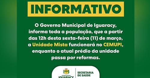 Informando – O prefeito de Iguaracy-PE, Zeinha Torres, comunica a todos os seus munícipes,que a partir desta sexta-feira (11), a Unidade Mista vai funcionar no CEMUPI, em virtude da reforma que está sendo realizada naquela unidade.