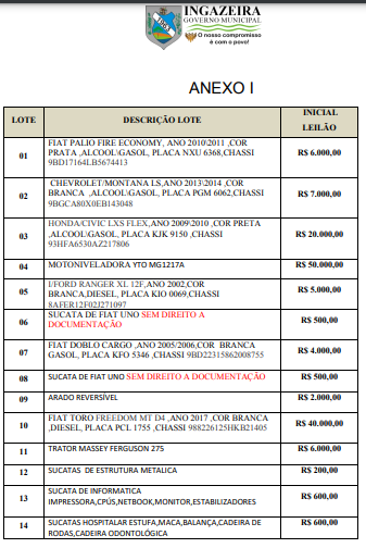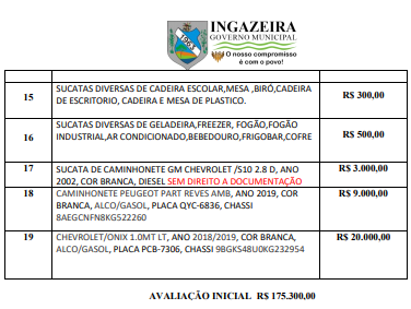 Leilão – A Prefeitura Municipal de Ingazeira-PE, pessoa Jurídica de direito público, inscrito no CNPJ/MF sob 10.477.615/0001-67 com sede na Albino Feitosa, nº 37 -Ingazeira -PE, CEP: 56830-000,(87) 3829-1102,email: esic@ingazeira.pe.gov.br Estado de Pernambuco, por intermédio de sua Comissão de acordo com o disposto na Lei 8.666/93 e alterações, em especial, as disposições de seu artigo 53, Decreto Federal nº 21.981/1932, Decreto Federal nº 22.427/1933 e Instrução Normativa DNRC nº 113/2010, torna público aos interessados que fará realizar LEILÃO, tipo Maior Lance, no dia 16 de ABRIL de 2021 com início às 10h00min, LEILÃO EXCLUSIVAMENTE ON-LINE , Município de INGAZEIRA, na SEDE DA Cidade e pelo endereço eletrônico www.lancecertoleiloes.com.br, para a alienação dos bens descritos no ANEXO I que é parte integrante deste Edital.
