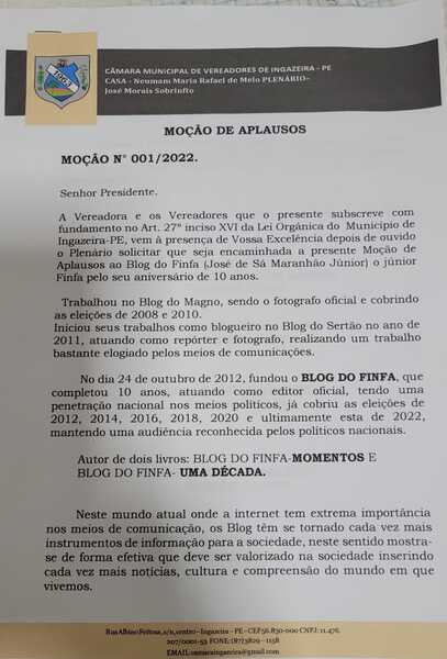 Mais uma Moção – A vereadora Deorlanda Carvalho (foto), apresentou ontem (09), na Sessão Ordinária da Câmara de Vereadores de Ingazeira, Moção de Aplausos pelos 10 anos deste Blog. A Moção de Aplausos foi coletiva e contou com as assinaturas de mais 07 vereadores da Casa Neumam Maria Rafael de Melo. Assinaram juntamente com a vereadora Deorlanda Carvalho, os seguintes parlamentares: Argemiro Morais, Dorneles Alencar, Juarez Ferreira, Djalminha Veras, Gustavo Véras, Josias Curumba e Genivaldo Souza.“O trabalho realizado pelo Blog do Finfa, através da informação rápida e confiável ao longo desses 10 anos foi uma das justificativas apresentadas na Moção”, disse Deorlanda. Quero agradecer aos 08 parlamentares, pela honrosa homenagem, mostrando que temos um reconhecimento de uma Década de trabalho. Muito obrigado e em breve irei receber com o maior prazer.
