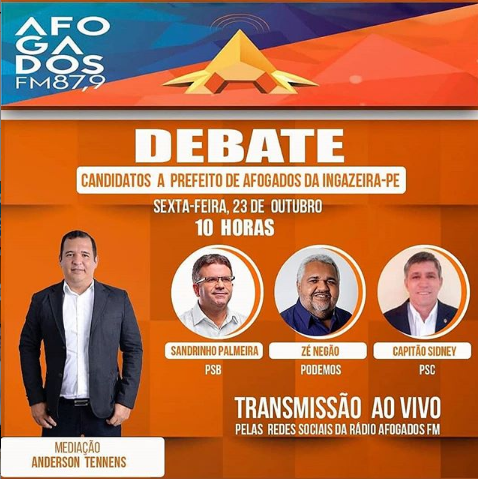 Debate – A Rádio Afogados FM, realiza nesta sexta-feira às 10 horas, o seu primeiro ‘DEBATE’, com os candidatoa a prefeito de Afogados da Ingazeira, com a mediação de Anderson Tennens. Confirmado as presenças de Sandrinho Palmeira, Zé Negão e Capitão Sidney, e terá a transmissão pelas redes sociais da Rádio Afogados FM, e também pela Rádio Pajeú. Este blogueiro juntamente com o colega Nill Júnior, estaremos analisando direto dos estúdio da Rádio Pajeú.