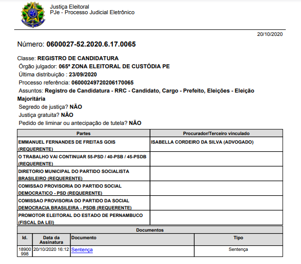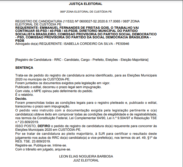 Deferida – o Candidato a reeleição de prefeito da cidade de Custódia-PE, Emmanuel Fernandes de Freitas Gois (Manuca), foi oficializado pela Justiça Eleitoral da 65ª Zona Eleitoral, através do Juiz Eleitoral Dr. Leon Elias Nogueira Barbosa, com seu deferimento do seu registro de candidatura para concorrer às eleições municipais em 15 de novembro.