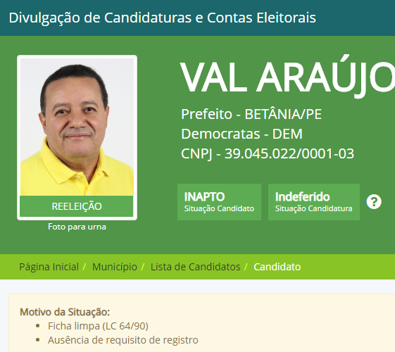 Indeferida – O pré-candidato a prefeito da cidade de Betânia-PE, Val Araujo, teve sua candidatura indeferida pelo Justiça Eleitoral. O motivo segundo o site Divulgação de Candidaturas e Contas Eleitorais, Ficha limpa (LC 64/90) e ausênciade requisito de registro.