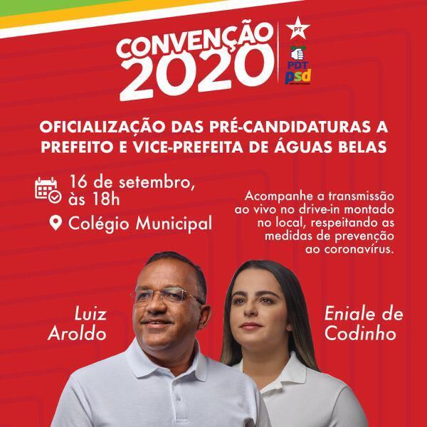 Convenção – Será na próxima quarta-feira (16), a convenção que vai homologar a chapa Luiz Aroldo-PT (prefeito) e Eniale de Codinho-PSD (vice-prefeita) em Águas Belas-PE. Neste ato serão apresentados 40 pré-candidatos, o evento teráinício às 18 horas, no Colégio Municipal.