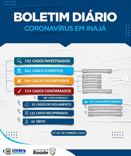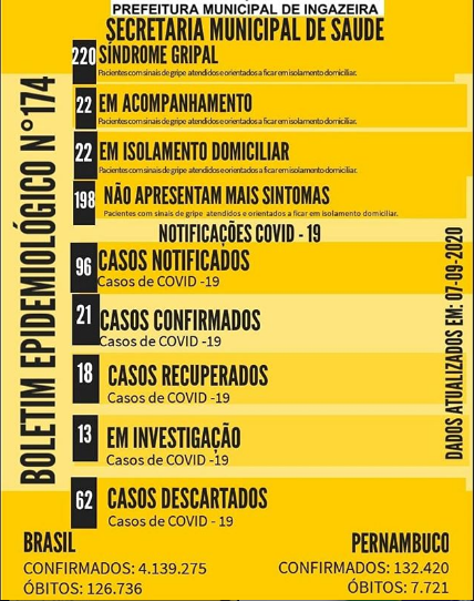 Covid-19 – A Secretaria Municipal de Saúde, da cidade de Iguaracy-Pe, confirmou que ontem (03), foram registrados dois casos para Covid-19, são pacientes que estavam em investigação e tiveram os resultados confirmados. Um paciente continua em isolamento domiciliar juntamente com os familiares, sendo acompanhados pela ESF (Estratégia de Saúde da Família) e pela Vigilância, e o outro encontra-se internada no hospital de Serra Talhada-PE. Seus contatos seguem monitorados pela ESF (Estratégia de Saúde da Família) e vigilância.