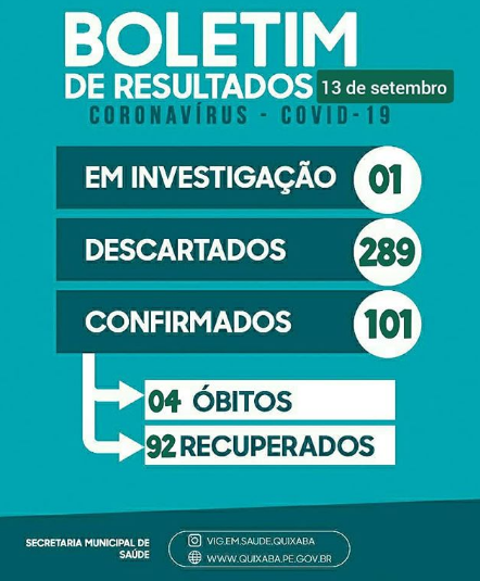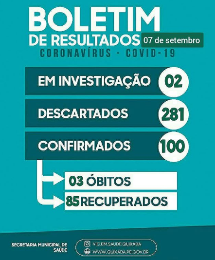 Um caso novo – A Secretaria de Saúde e Vigilância em Saúde, da cidade de Quixaba-PE, confirmou ontem (03), um novo caso de Covid-19, paciente do sexo feminino, 28 anos, e encontra-se realizando isolamento domiciliar. A Secretaria de Saúde, também informa que quatro casos foram descartados, pacientes do sexo masculino, 34 e 55 anos e pacientes do sexo feminino, 27 e 31 anos.