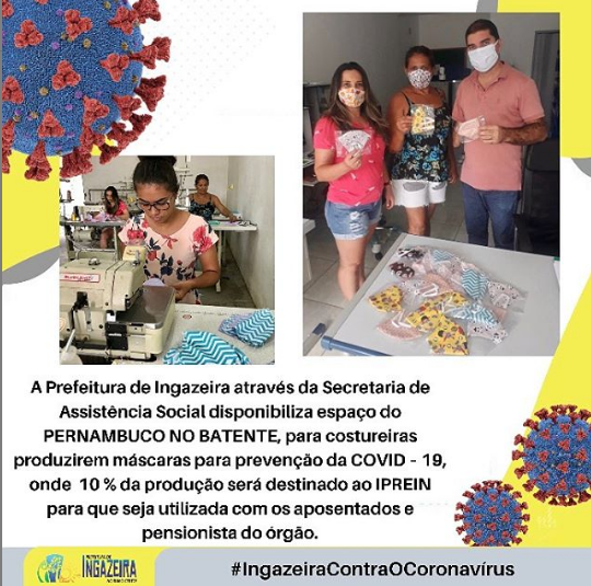 Produzindo – A Prefeitura da Ingazeira-PE, através da Secretaria de Assistência Social, disponibilizou dentro do Programa ‘Pernambuco no Batente’, costureiras para produzirem máscaras para prevenção ao Covid-19. Segundo o prefeito Lino Morais, em contato com este blogueiro, 10% da produção será destinada ao Instituto de Previdência Municipal da Ingazeira – IPREIN, que serão destinadas aos aposentados e pensionistas.