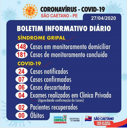 Covid-19 – A Secretaria de Saúde de Serra Talhada informa, nesta terça-feira (28.04), que 4 novos possíveis casos de Covid-19 estão em investigação. Também registramos o descarte de um caso que estava em análise.Portanto, no nosso boletim diário constam: 9 casos em investigação, 27 descartados, 8 confirmados e 1 recuperado.