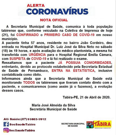 Primeiro caso – A Secretaria Municipal de Saúde, da cidade de Tabira-PE, confirmou o primeiro caso de Covid-19 no município, através desta nota oficial.