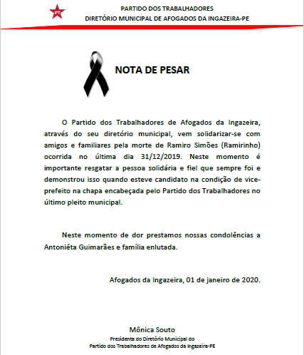 Nota de Pesar – O Partido dos Trabalhadores de Afogados da Ingazeira, emitiu Nota de Pesar, pela morte de Ramiro Mendes, conhecido carinhosamente por Ramirinho, irmão da ex-prefeita de Afogados da Ingazeira, Giza Simões (in memoriam).