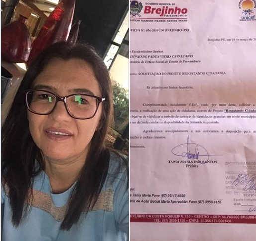 Solicitou – A prefeita de Brejinho-PE, Tânia Maria, solicitou à Secretaria de Defesa Social de Pernambuco, através do projeto “Resgatando Cidadania”, emissão de Carteira de Identidade gratuita. “Em breve haverá um dia para emitir segunda via de certidão de casamento, nascimento, óbito e identidade. Quem estiver precisando desses documentos, é bom ficarem atentos, mesmo assim estaremos avisando. Este é um convênio da Prefeitura de Brejinho com o Governo do Estado”, disse a prefeita.