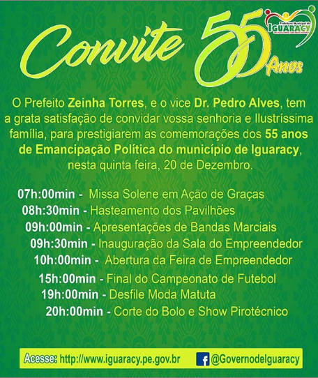Comemoram – As cidades de Ingazeira e Iguaracy, comemoram nesta quinta-feira (20), 55 anos de emancipação política. Os prefeitos Lino Morais e Zeinha Torres, respectivamente, comemoram com a população.